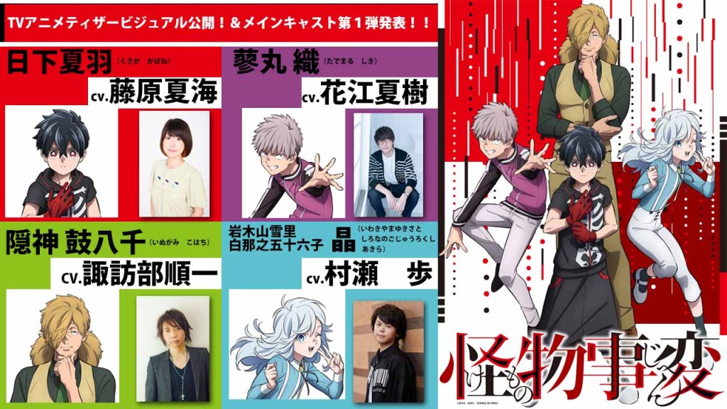 隠神 鼓八千(いぬがみ こはち)声 – 諏訪部順一[2]36歳(人間時)。9月1日生まれ。身長180センチメートル。体重76キログラム。探偵を営む化狸。具現化させる能力を持つ。